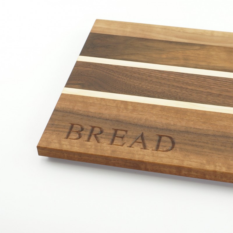 It features the engraving Bread which is carved onto the top surface of the board. The bread board pictured is the exact board that you will receive.