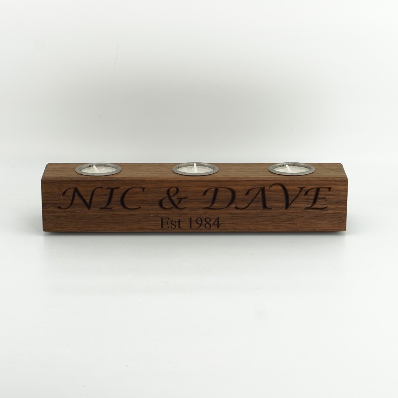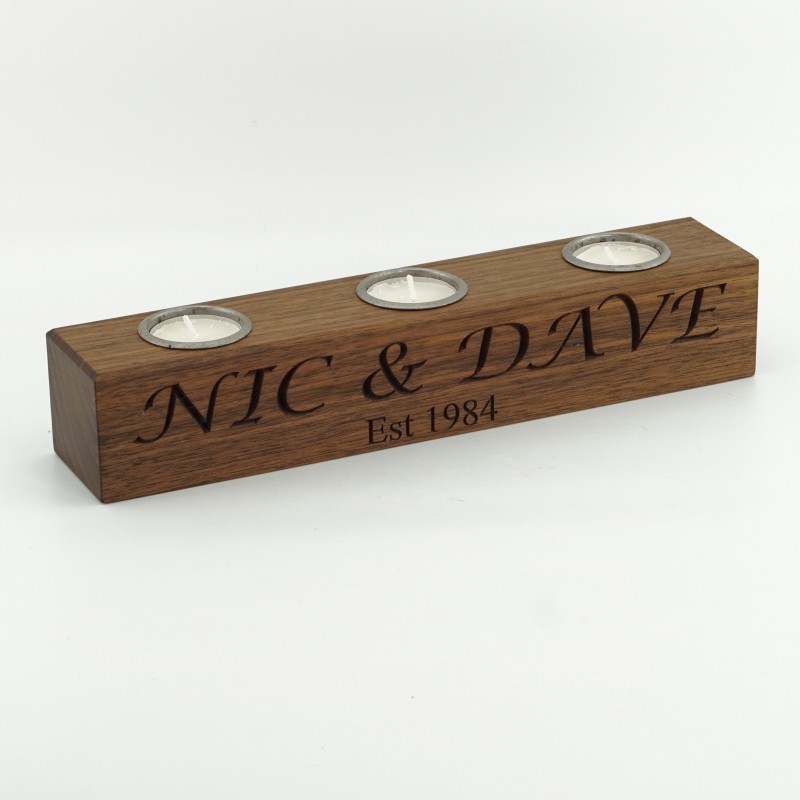 Made from high quality walnut wood, this charming tea light holder box features three openings for a tea light candle. The front of the box can be fully personalised with the engraving of your choice, including names and established date.